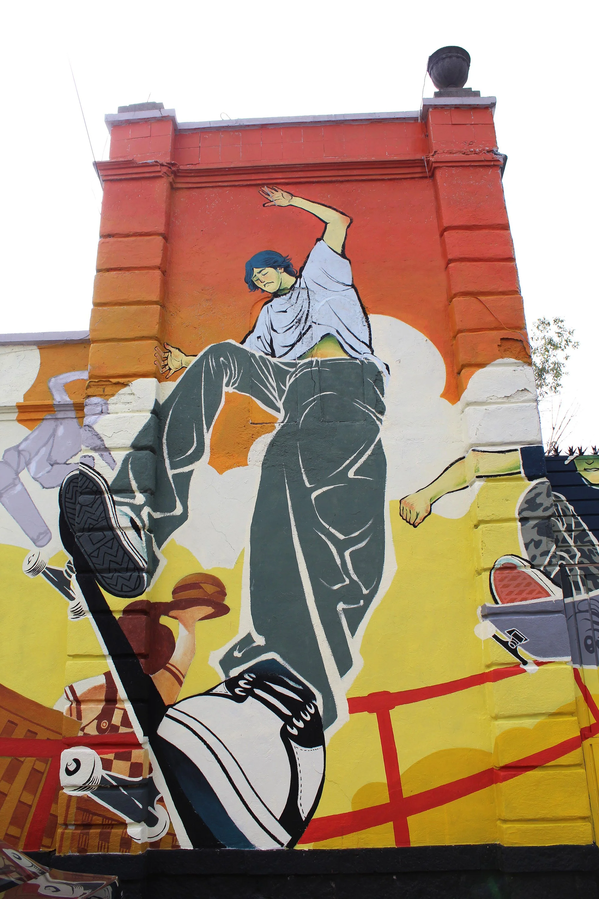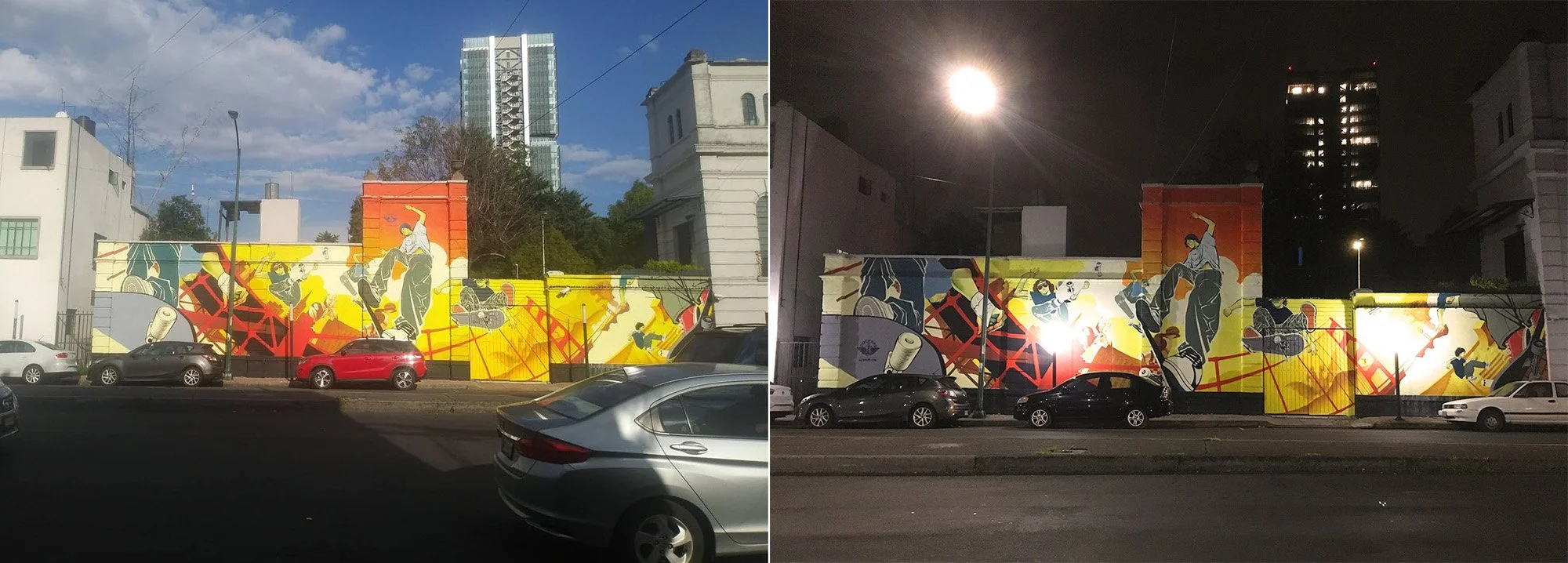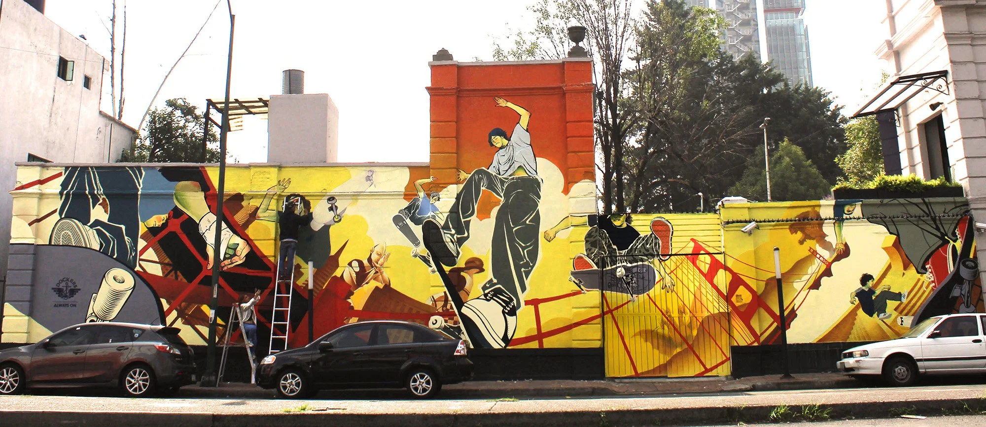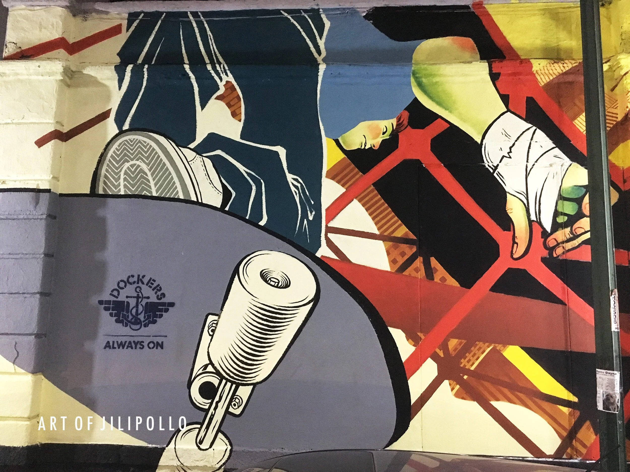I was chosen along with other great colleagues to develop and paint a mural showing the new juvenile clothes that Dockers released. The brand wanted to tell a story with a lot of movement, where the release of their new product (jeans pants) are confortable and flexible, perfect for urban sports and traveling.