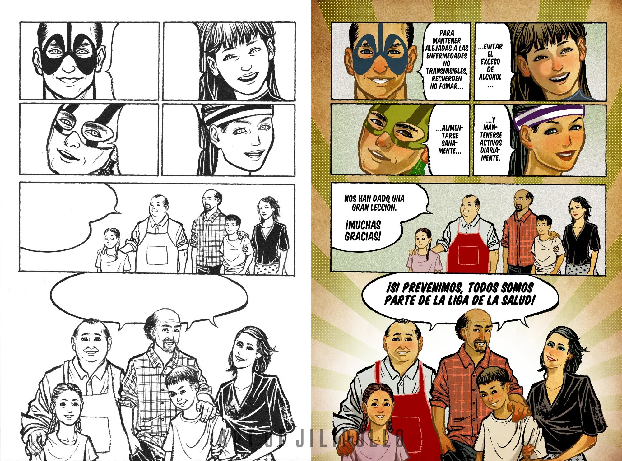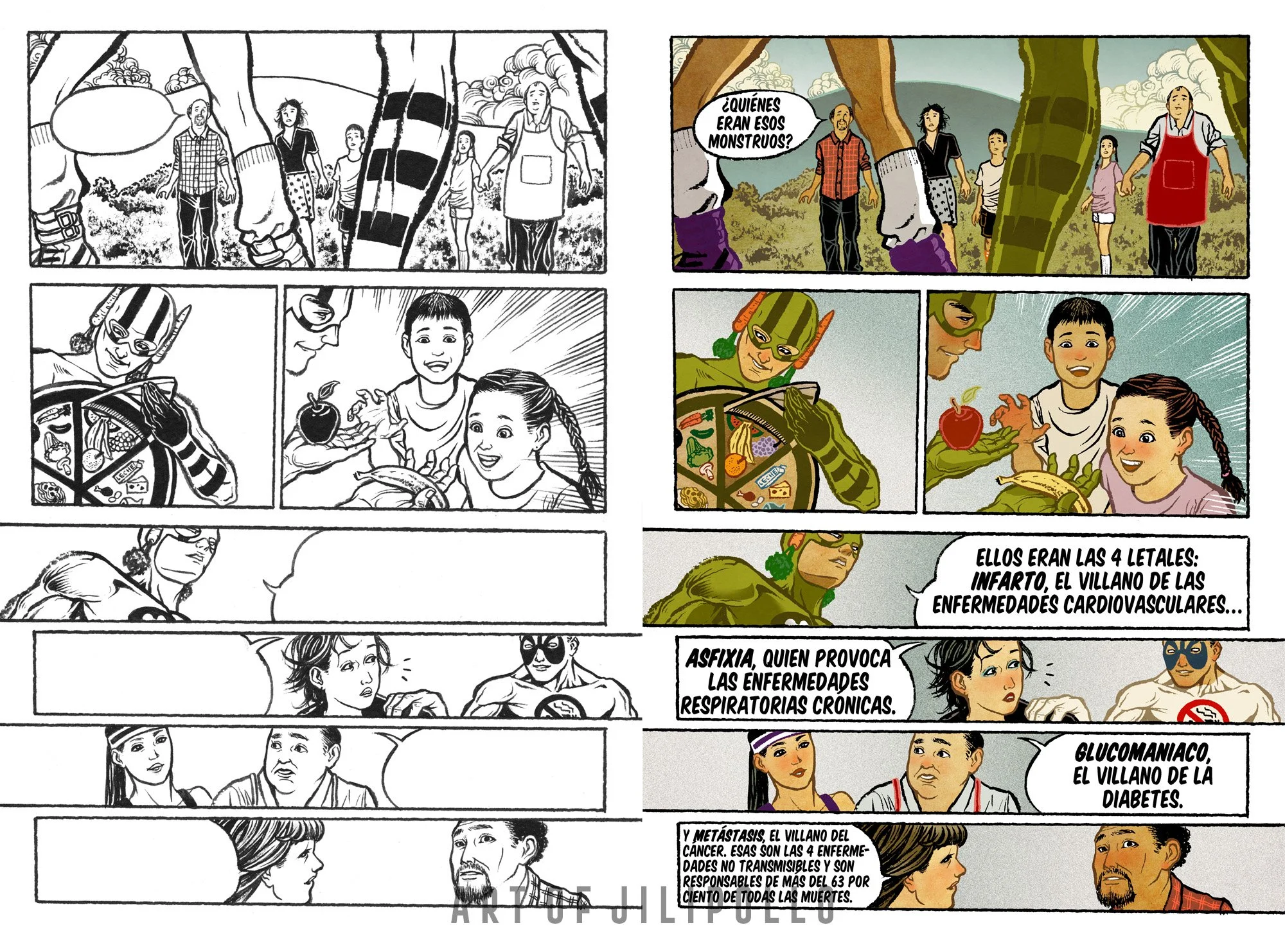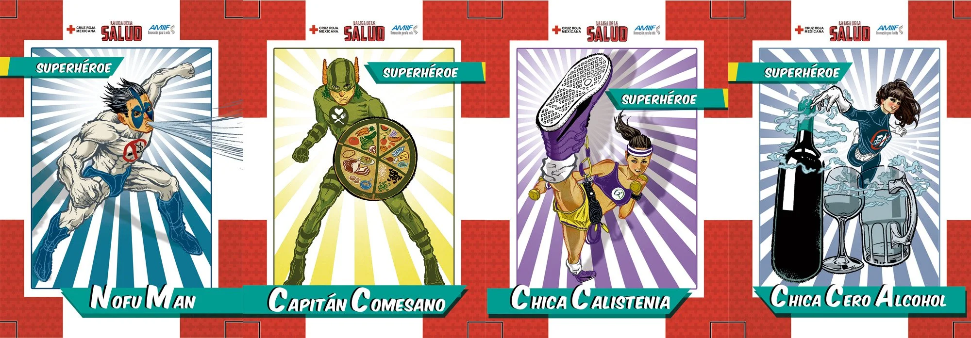 I WAS COMMISSIONED TO MAKE A COMIC TO PROMOTE HEALTH BETWEEN YOUNG STUDENTS. "The Health League" taught 2,000 elementary school students the importance of comprehensive health care and healthy habits. This educational program was created by the Mexican Association of Pharmaceutical Research Industries and the Mexican Red Cross to prevent chronic diseases such as obesity and diabetes. The children learned through workshops, comics, and flashcards.