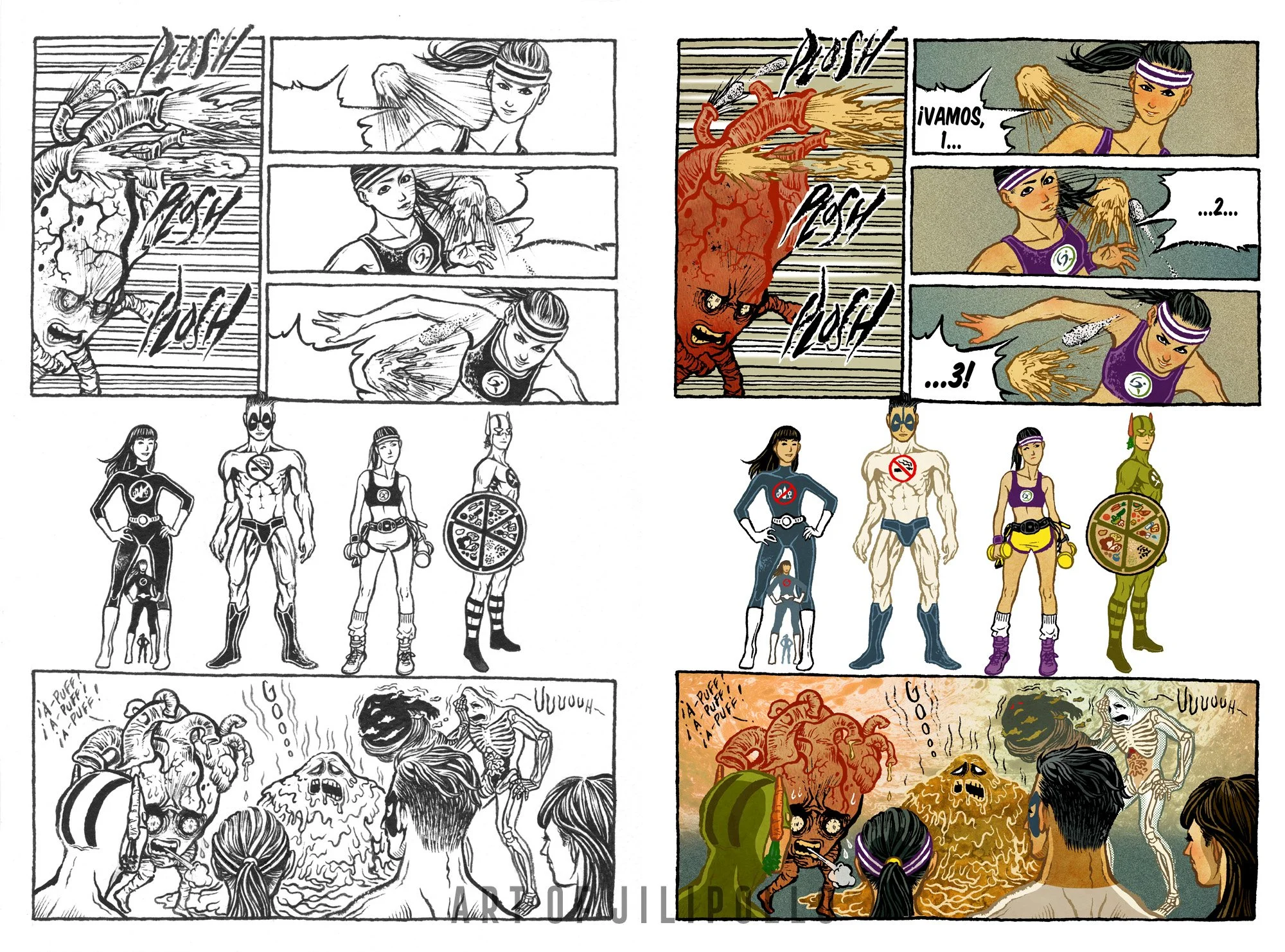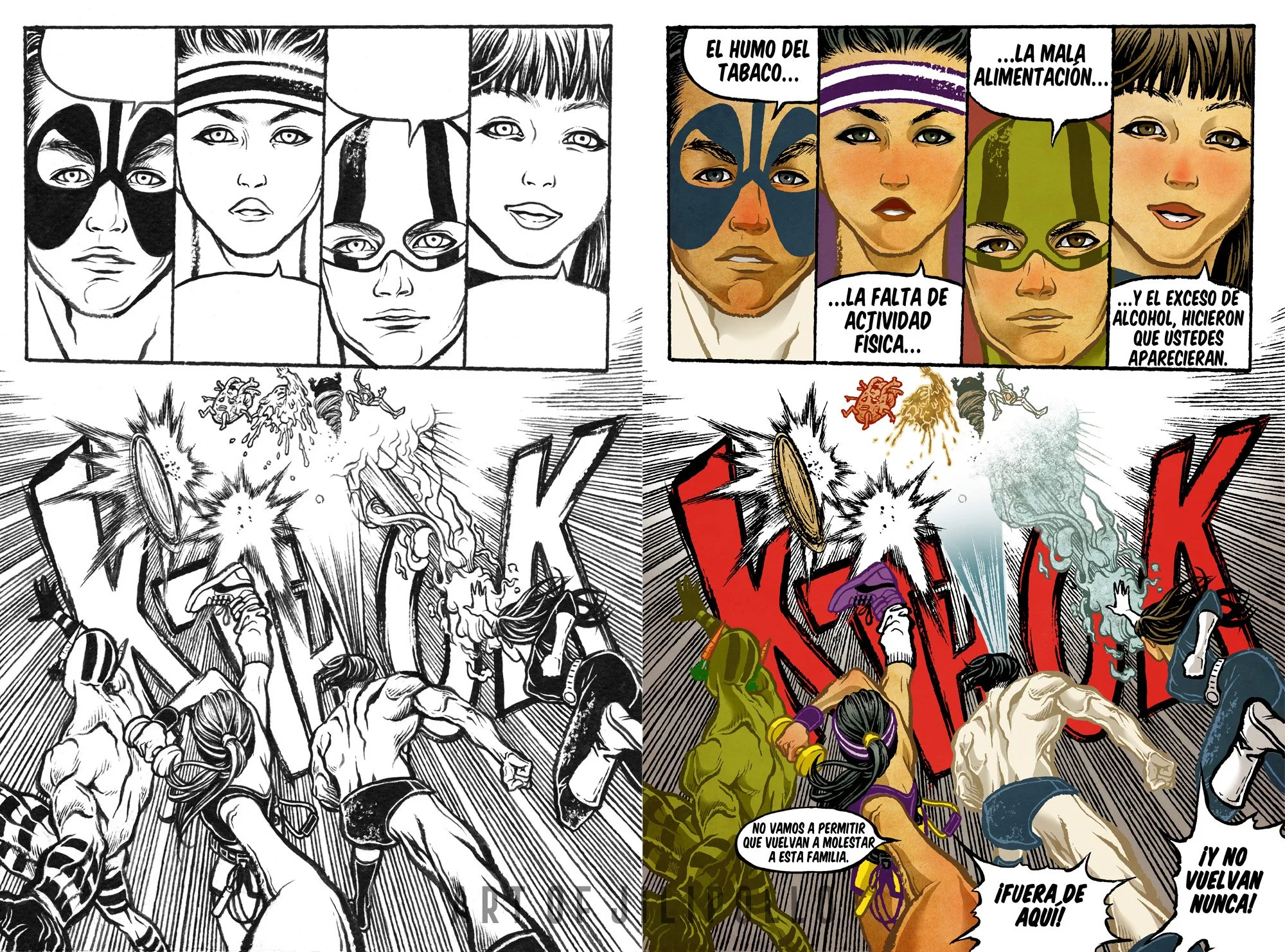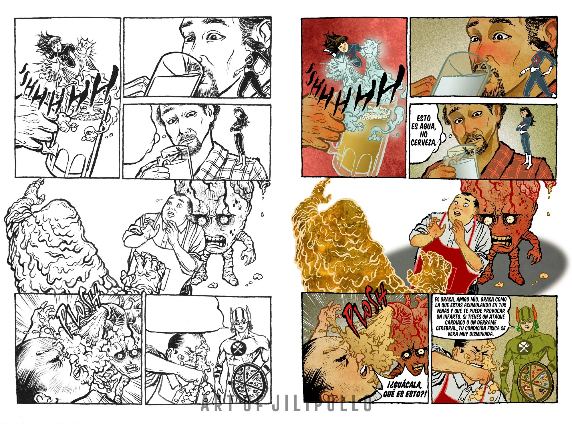 I WAS COMMISSIONED TO MAKE A COMIC TO PROMOTE HEALTH BETWEEN YOUNG STUDENTS. "The Health League" taught 2,000 elementary school students the importance of comprehensive health care and healthy habits. This educational program was created by the Mexican Association of Pharmaceutical Research Industries and the Mexican Red Cross to prevent chronic diseases such as obesity and diabetes. The children learned through workshops, comics, and flashcards.