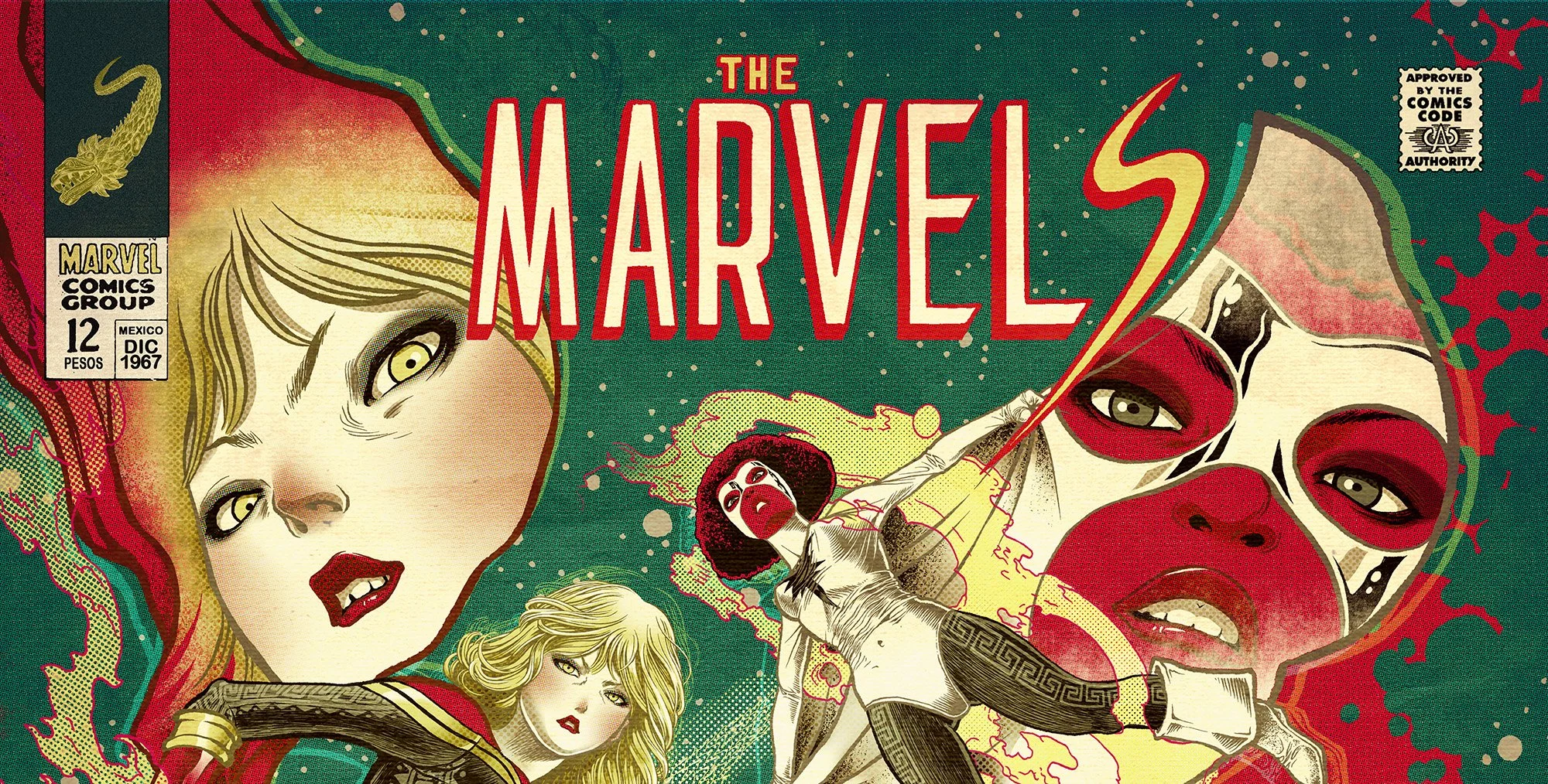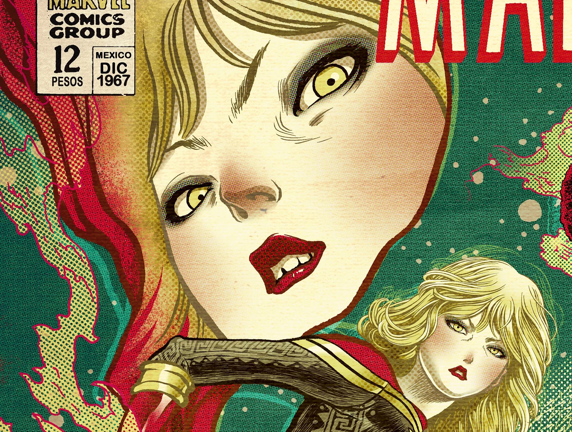 The illustration also needed to include something Mexican, as the final objective was to present the image inside cinemas in Mexico, so I placed the "Quetzalcoatl", theAztec's feathered serpent forming the shape of the "S" from "The MarvelS", and as a central element for the composition, along with some prehispanic symbols in the heroine's outfit.